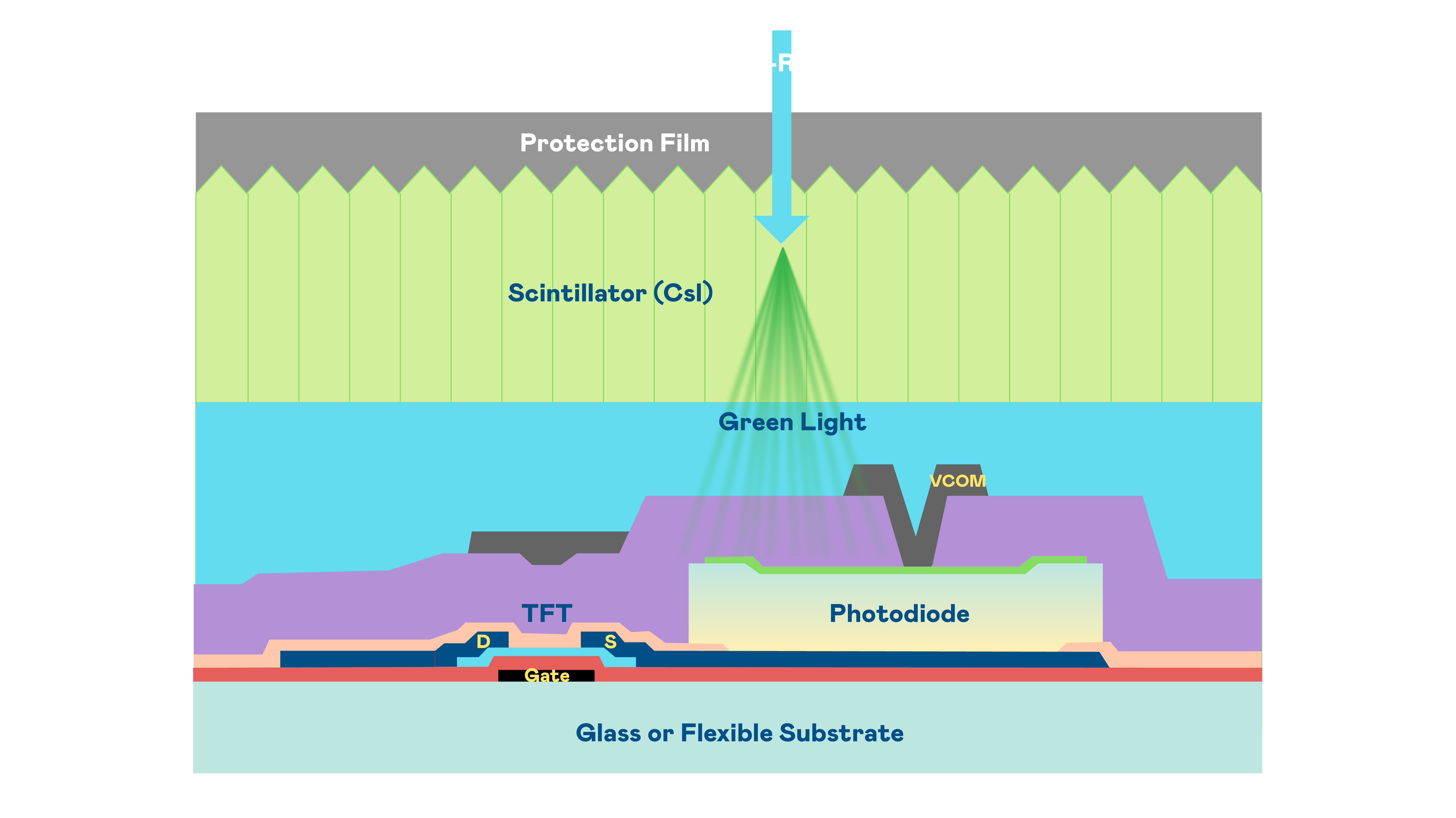 w66旗舰厅的X光影像感测阵列使用薄膜电晶体 (TFT) 作为每个像素的读取开关,搭配光电二极体(Photodiode)的光电转换元件,用以感测X光影像讯号。
